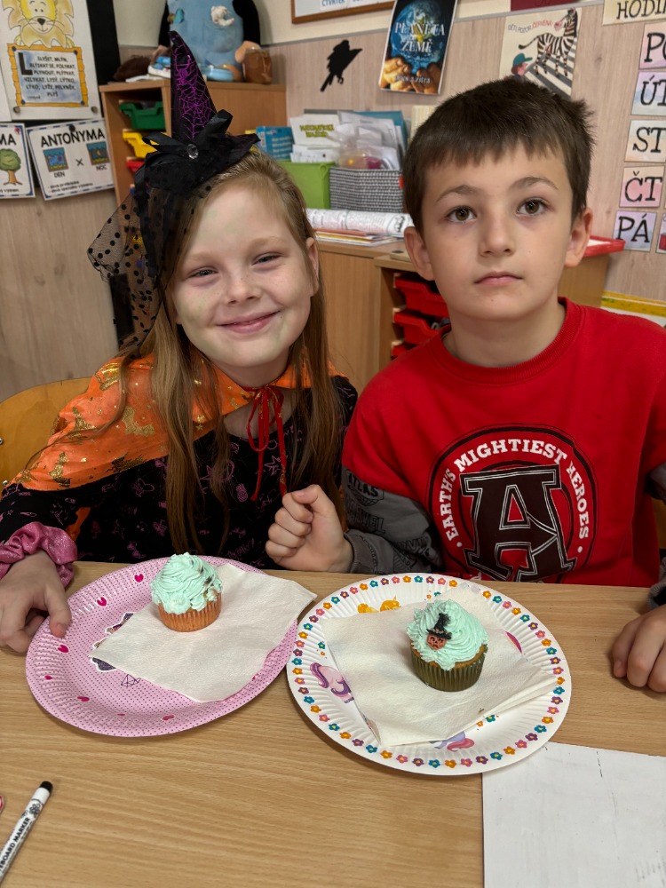 Ve čtvrtek 31. října se naše třída oblékla do Halloweenského šatu a my také. Celé dopoledne bylo zaměřené na tento svátek formou projektového učení a také mlsání. Hráli jsme Halloweenské BINGO, řešili šifru-běhačka se zaměřením na čtení s porozuměním, počítání s Halloweenskými symboly, které zastupovaly čísla, zpívali a tancovali na píseň Trick or trick…, krokování ve čtvercové síti, kde nám vyšel strašidelný hrad a v neposlední řadě dokončili společný třídní kolektivní obraz také s tímto tématem. Abychom to zvládli, paní učitelka nám připravila tousty a mlsky ve tvaru duchů, pavoučků a strašidel. Maminka od Lucinky přinesla mufiny ozdobené malými čarodějkami. Také byl zajištěn přísun vitamínů: nakrájená jablíčka, mrkvičky, papriky. Moc se nám to líbilo a s chutí jsme vše splnili. Vzájemná pomoc a práce ve skupinách je samozřejmost. Už se těšíme na další aktivity, hry, běhačky.